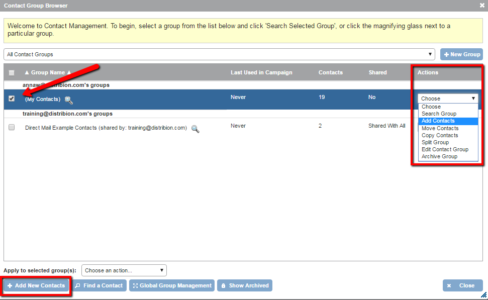 - If adding to one group, you can select the "Actions" pull down menu to the right of group and select “Add Contacts"