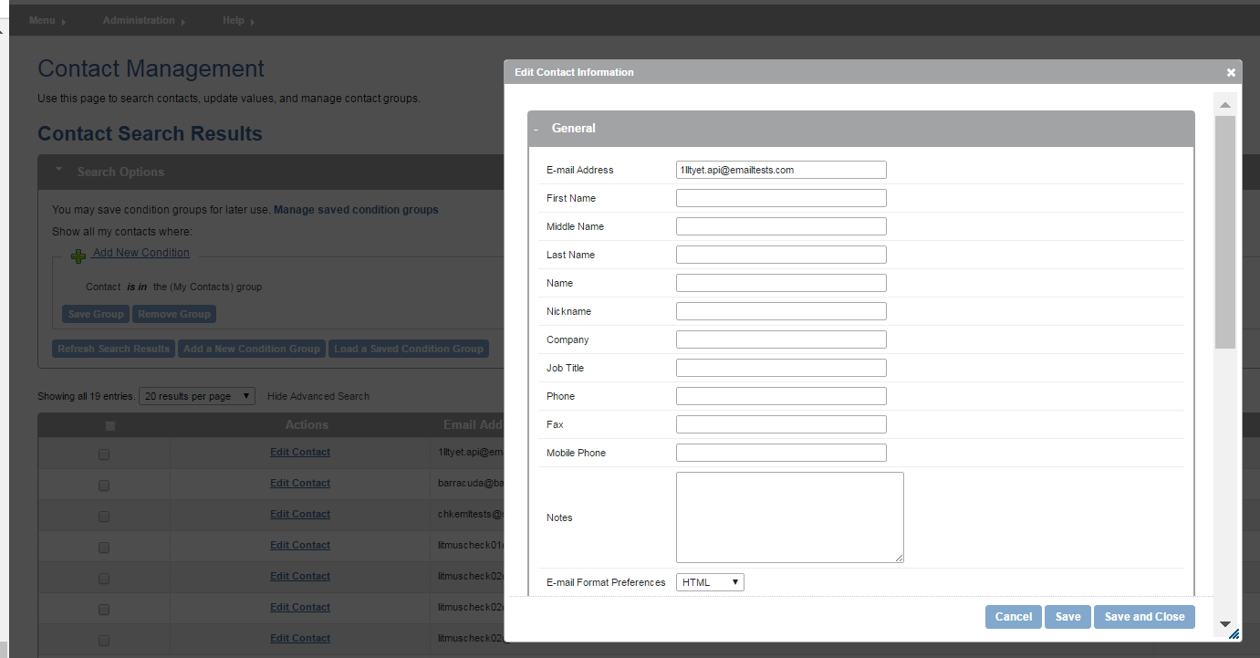 - You will then be on the “Contact Search Results” page for the group selected. If looking for a specific contact to delete, you would need to create a condition that will search for that contact using email address or other search options. To create the condition to locate contact please follow instructions on page 10 Section B and page 11 …………….. Once the condition is created and email is located. Check the box next to the contact and select “Remove Results from Contact Group”