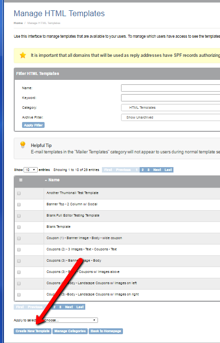 To start, navigate using the main menu to Adminstration > E-mail Marketing System > Manage Templates. Once on that page scroll to the bottom and click on Create New Template.