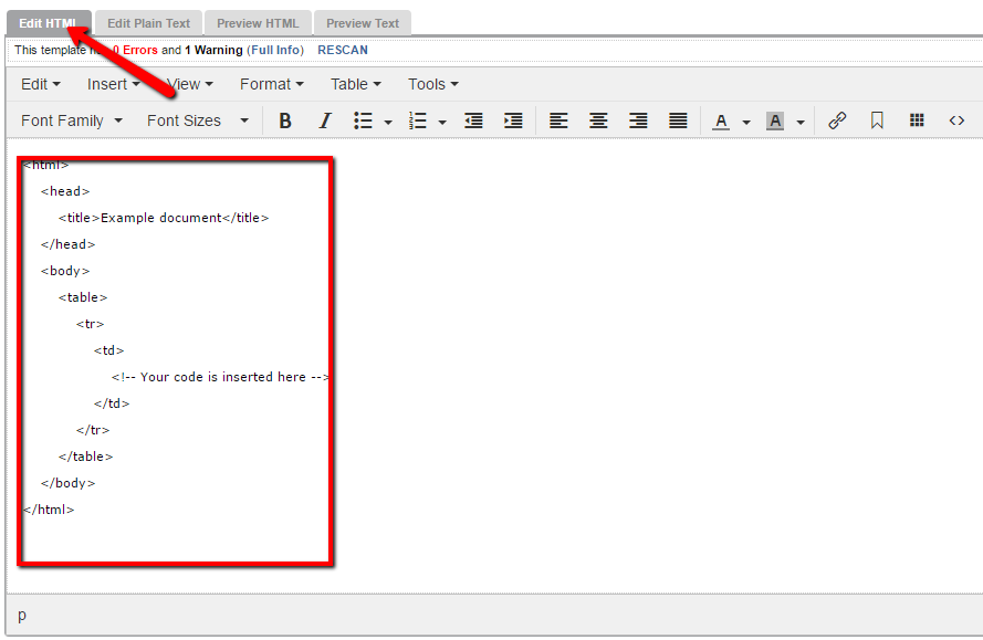 - If you chose option B (Create HTML using On-line Editor) you will be taken directly to the main editing page for HTML email templates. Scroll down to the “Edit Template” region.