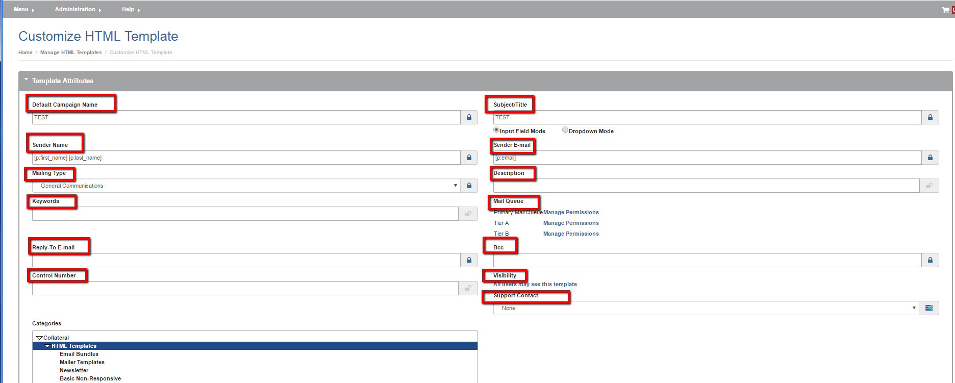 Some of the template attributes will be populated with default information. You can modify these if you desire. Areas with Manage Permissions use the permissions features of the system.