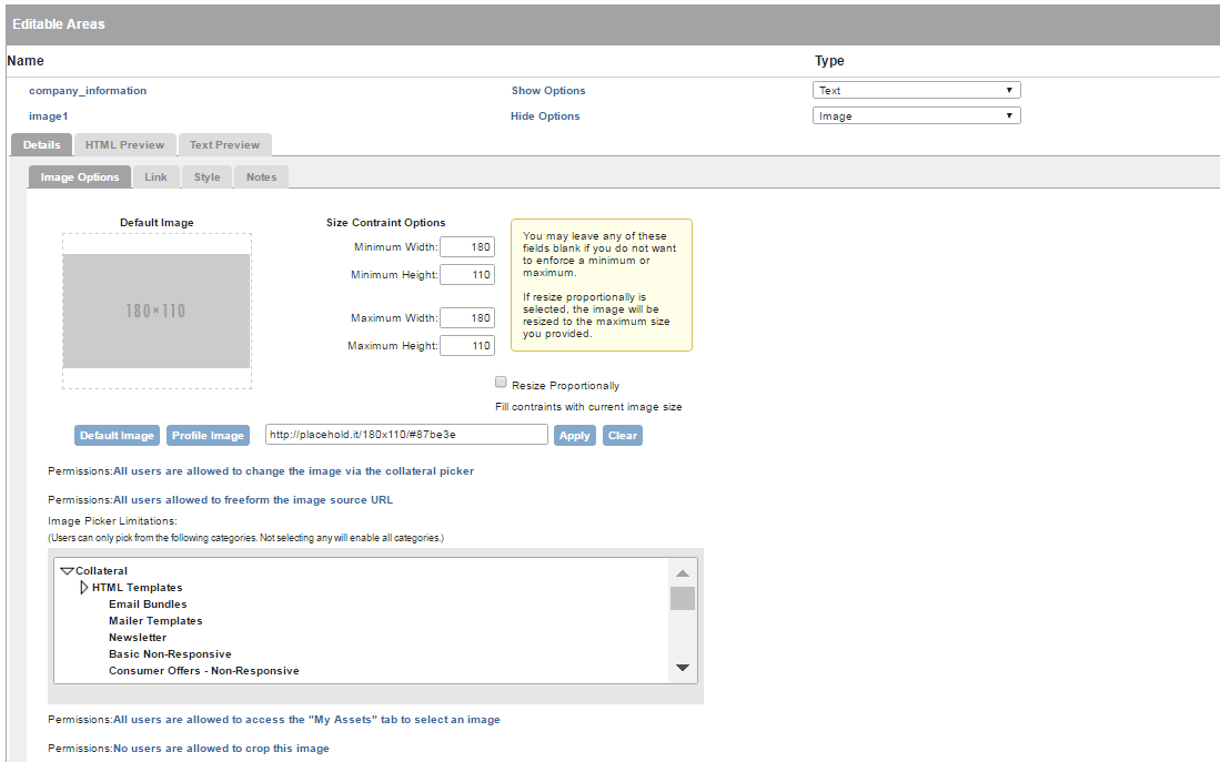 - The “Image Options” tab will allow you to set the default content, minimum and maximum size, permissions and a few other settings.