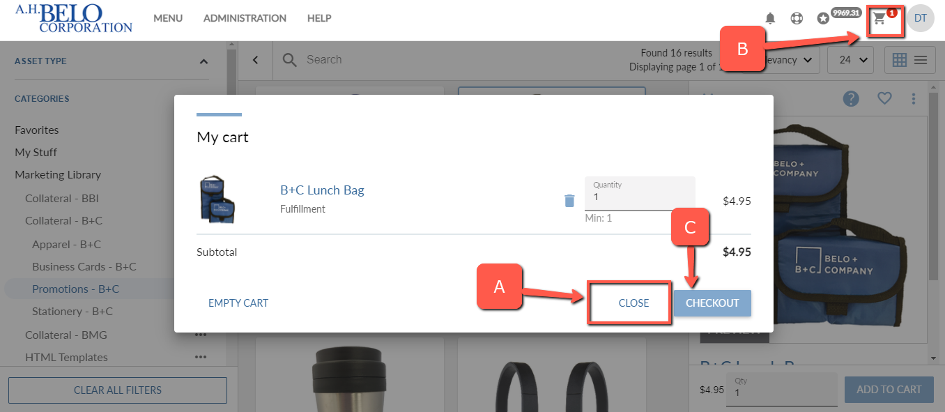 - (B) If you close your cart and decide not to select another collateral item to add to your cart, you can click the cart icon to access your cart as mentioned on page 3 of this guide.