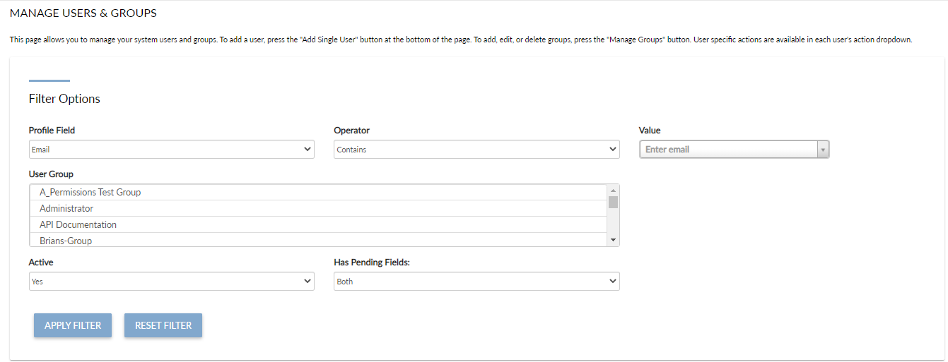 After setting the appropriate search criteria in the Filter Options section, an administrator may continue and click on the Apply Filter button to present the resulting User accounts.