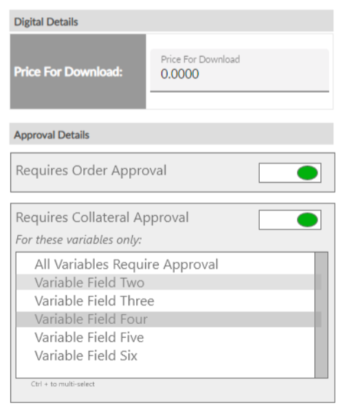 Variables of these types will be included for the purpose of approval triggers. To make the changes on the pdf go to the fulfillment details tab. On the bottom right the will give you the options for approval changes.