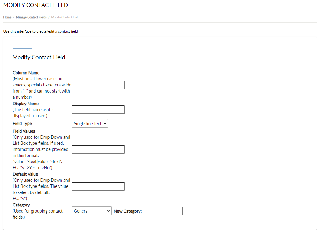 Category: Select an existing category for the new contact field to be assigned to. Or type in a new category name if a new one is needed. A contact field can only be assigned to a single category.